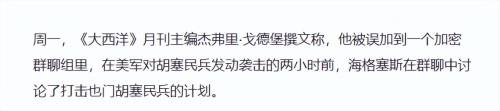 今年早些时候,据媒体披露,赫格塞思与其团队使用一个私人Signal群聊讨论对也门胡塞武装的空袭计划,误将媒体人戈德伯格加入群内。