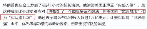 “我告诉皮特(指赫格塞思),我们应该把这些危险的城市用作我们军队、国民警卫队的训练场,但军队呢?我们很快就要进驻芝加哥了,那是一个大城市,但州长又不称职。”