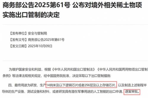 那么,我们能怎么办呢?这次中方发布的稀土物项管制措施,其中第四条写明:最终用途为研发、生产14纳米及以下逻辑芯片或者256层及以上存储芯片,以及制造上述制程半导体的生产设备、测试设备和材料,或者研发具有潜在军事用途的人工智能的出口申请,逐案审批。