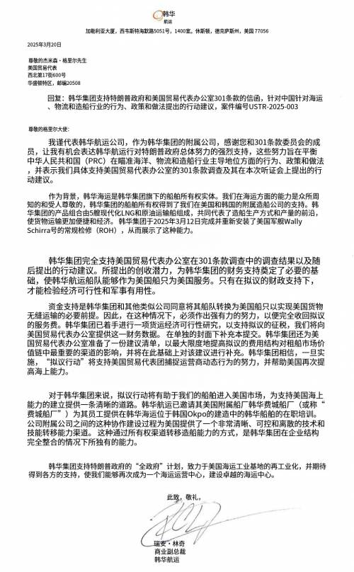 根据下载的文件抬头的日期,可以确认这是一份今年3月20日递交的文件,美国贸易代表办公室是在今年4月17日出台的对中国收取特别港口费政策的,尽管不能确定这之间是否有前因后果的关系,但至少有一点是可以确认的,韩华海洋这厮绝对是这一政策促成因素之一。