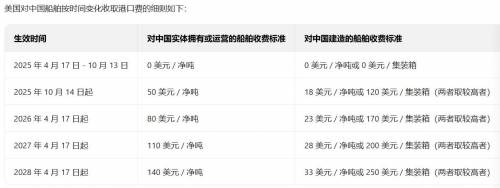 这个所谓的301调查指的就是今年4月17日,美国贸易代表办公室发布了对中国海事、物流及造船业301调查措施,决定自2025年10月14日起,对中国公司拥有或运营的船舶、中国造船舶、中国籍船舶加收港口服务费。根据美方公开的数据实行的是阶梯收费: