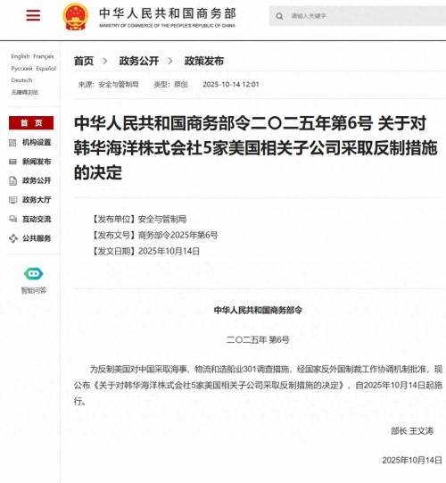 为反制美国对中国采取海事、物流和造船业301调查措施,经国家反外国制裁工作协调机制批准,现公布《关于对韩华海洋株式会社5家美国相关子公司采取反制措施的决定》,自2025年10月14日起施行。