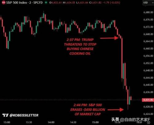 当然,这并不是其一,特朗普还有骚操作,特朗普威胁中国再不购买美国的大豆,就不采购中方的食用油,一句话说完,美股应声下跌7分钟之内损失了4500亿。