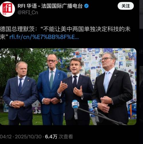 现在中美达成协议,德国慌了,担心中美联手收割欧洲,德国总理默茨与法国总统马克龙在接受媒体采访的时候,一再强调,“不能让美中两国单独决定科技的未来”。