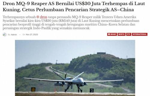 服役后事故始终不断的美制MQ-9无人机,日前在韩国附近海域坠毁一事,本来没有引起太大波澜。但随着亚洲“Defence Security Asia”网站指出,这架MQ-9坠毁前在敏感区域活动,可能承担情报侦察任务,且坠毁地点也很特殊,至今尚未完全核心零部件打捞,局面又变得微妙起来。