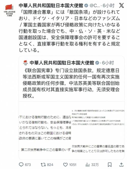 更值得关注的是,中国驻日使馆还公开提及《联合国宪章》中的“敌国条款”——这是对二战轴心国预防性约束的法律依据。