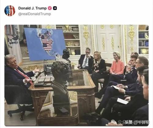我看到,特朗普又在自己社交账号上,贴出了他在白宫会见欧盟领导人的照片。特朗普端坐老板椅,马克龙、默茨、冯德莱恩、斯塔默等一众欧洲领导人,对面排排坐小板凳。