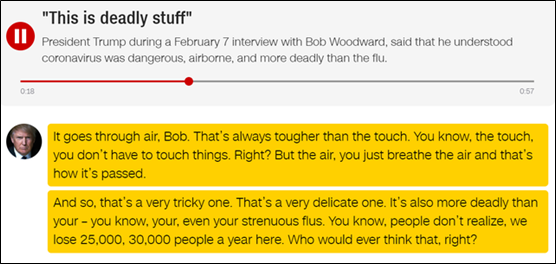 伍德沃德发布的一则录音显示,早在2月7日,特朗普就曾对自己表示,新冠病毒“非常致命(deadly stuff),危害远大于流感。”