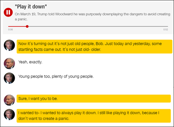 3月19日,特朗普在接受采访时曾对伍德沃德称,自己知道疫情的严重性,比如病毒不仅会感染老年人,也有许多年轻人感染,但他同时却表示自己“希望淡化此事”。