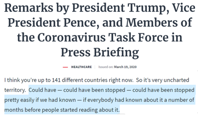 但在同一天,特朗普又在白宫的疫情发布会上宣称,美国的疫情暴发,是因为“中国没有及时把情况告知自己”,还说假如自己早点知道相关情况,疫情会很容易就能控制住。