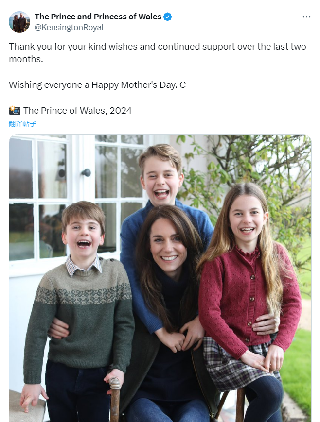 当天是英国的母亲节,威廉晒出一张凯特和三个孩子的近照,并配文:感谢大家美好的祝福和过去两个月以来对我们的支持,祝大家母亲节快乐。
