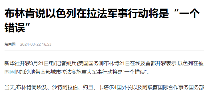 然后在今天,出现了搞笑的事:在中东各国又转一圈,要大家千万别激动的布林肯,又跑到以色列,说要和内塔尼亚胡谈谈,劝他打消进攻拉法的计划,因为有“别的选项”。