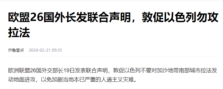 像在今年2月19号,欧洲联盟26国外交部长就发表联合声明,公开敦促以色列不要对拉法发动地面进攻,“以免加剧当地本已严重的人道主义灾难”。