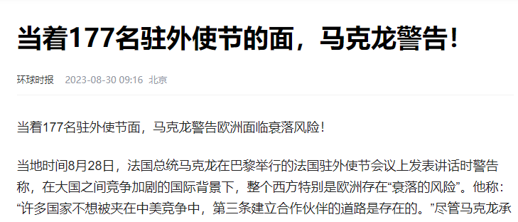 事情得从去年8月说起,这事我之前也讲过:当时法国总统马克龙当着177名驻法使节的面,说了一番话,所有在场的人听了后,都觉得极其意外!