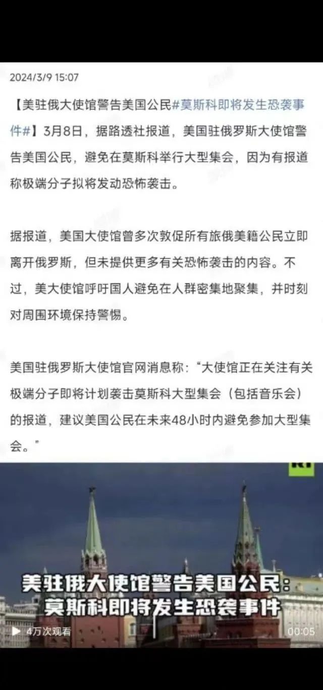 而且,美国人还不打自招!因为,美国人竟然在事前就似乎知道了俄罗斯要被恐怖袭击。早在3月8日,美国驻俄罗斯大使馆就警告,美国公民要避免在莫斯科举行大型集会,因为极端分子可能要发动恐怖袭击。