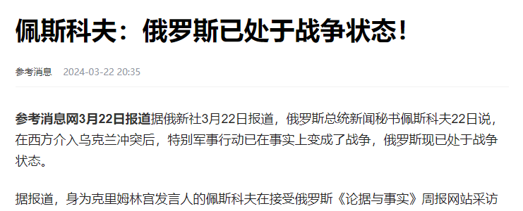 可以说,此次恐袭事件发生的节点极其不寻常!它不仅发生在俄罗斯大选刚刚结束,同时也发生在俄罗斯准备摆出更强硬的姿态,应对俄乌冲突之后。因为,就在前两天,普京的新闻秘书佩斯科夫竟然罕见地表示,现在的俄罗斯已经进入了战争状态,这很可能说明,俄罗斯要对乌克兰下重手了!