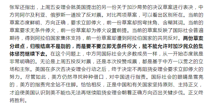 中国常驻联合国代表张军说道:安理会决议是有约束力的!中方要求当事方履行《联合国宪章》规定的义务,根据决议要求采取应有行动。中方期待有重要影响的国家对当事方发挥积极作用,包括采取一切有效手段支持决议的实施。