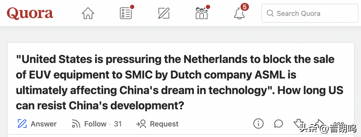 “美国阻止荷兰ASML公司向中国中芯国际出售EUV设备,来限制中国技术研发的梦想。对于中国的发展,美国还能阻止多久呢?”