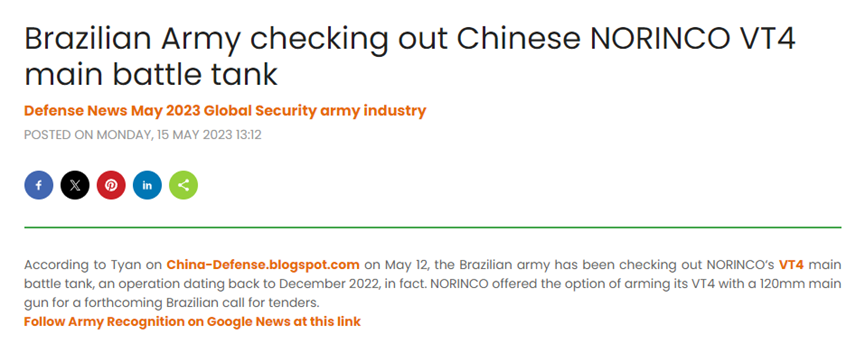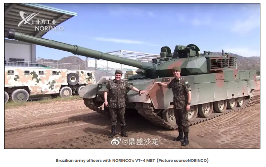 事实上,除了哥伦比亚,有意引进VT-4的南美国家还有巴西。巴西装甲部队的装备来源复杂,包括进口和国产型号,其中主力坦克是升级版的“豹1A5BR”,以提高其战斗力并延长使用寿命。但俄乌冲突已经证明,这种过时的坦克在现代战场上几乎没有任何战斗力,因此外媒透露,巴西代表团去年曾访问北方工业公司并亲自登上VT-4进行考察。