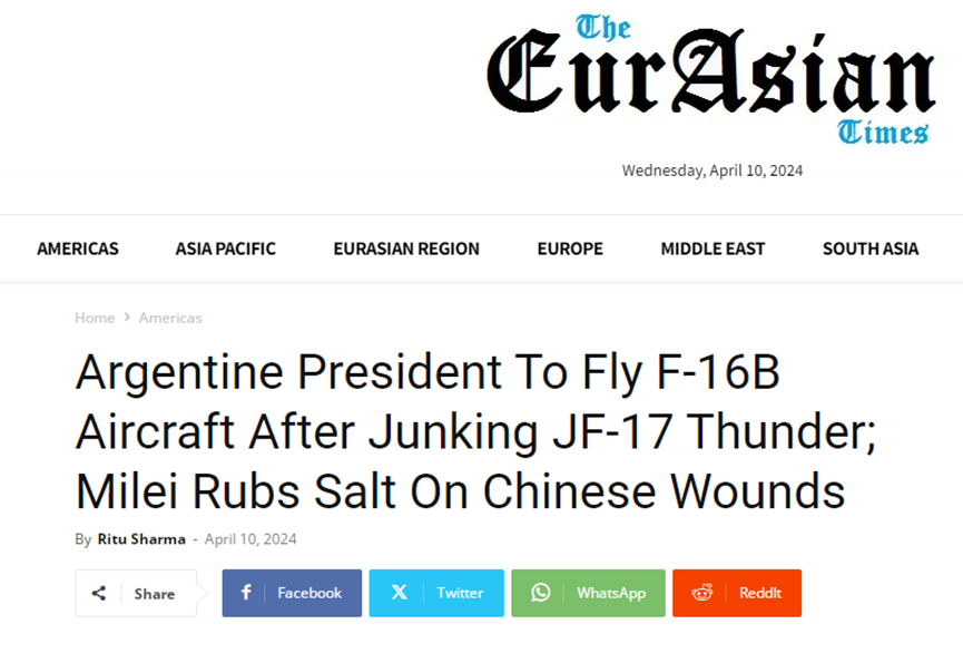 而印度《欧亚时报》近日报道称,在正式与丹麦购买二手F-16战斗机之前,米莱还在访问丹麦期间搭乘双座的F-16B战斗机升空。该报道将米莱这种“充满挑衅”的举动称为是“在中国的伤口上撒盐”。“批准丹麦向阿根廷出售F-16战机是美国在与中国竞争中的外交胜利。”阿根廷新闻媒体也称之为“华盛顿与北京直接竞争的具有巨大地缘政治影响的行动”。