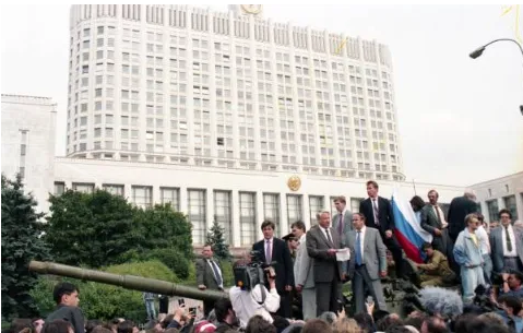1991 年 8 月,莫斯科,苏维埃联邦社会主义共和国最高苏维埃主席叶利钦站在坦克上,反抗苏联共产 党(CPSU)强硬派成员发动的八月政变(图源:Getty Images)