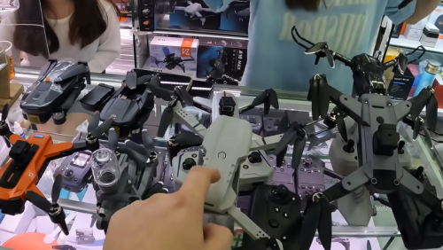 是我在2024年看到的两个德国视频博主在深圳华强北逛街,他们想买无人机,结果145元人民币就买到了,下图德国博主手指着的无人机,有两个摄像头。