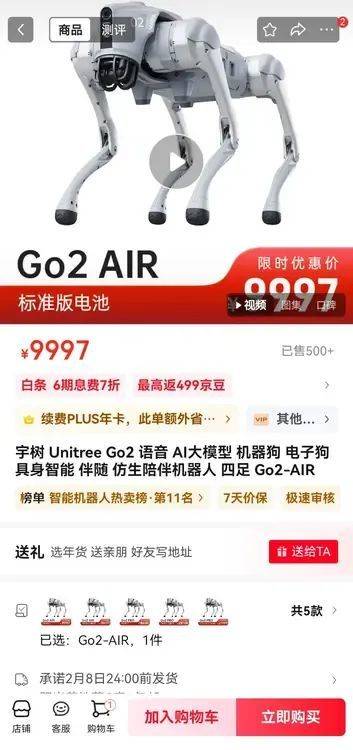 我当时觉得有点吃惊,因为印象中这个东西还是比较贵的,而且更多用于军事领域,怎么就随便一个学生也能买来玩了,于是我在京东上搜了下,发现宇树科技的Go2 air 只要9997元人民币就可以包邮到家了,没错已经降到了1万元人民币。