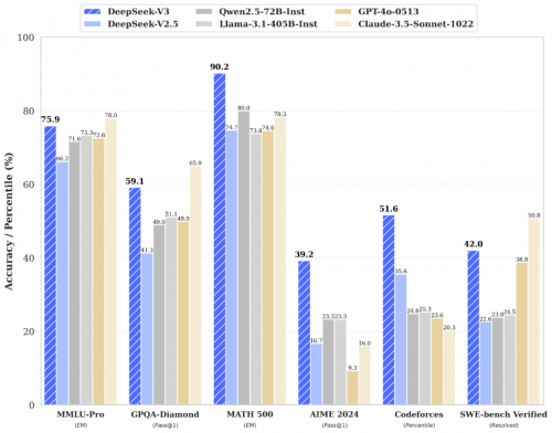 Deepseek-V3与多个国内外大模型的测试数据对比。 “Deepseek”公众号
