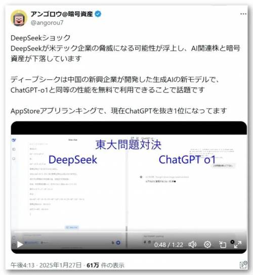 日本币圈大V放出一段视频:东京大学入学考试的一道题目,让DeepSeek和ChatGpT同时解题。DeepSeek唰唰解题到第48秒,ChatGpT才开始写……
