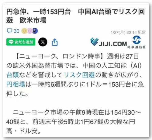 27日晚上10点过后,《时事通信社》报道是报道了。“欧美外汇市场上,警戒中国AI势起,规避风险的动作扩大,日元一度急涨至153日元多”。