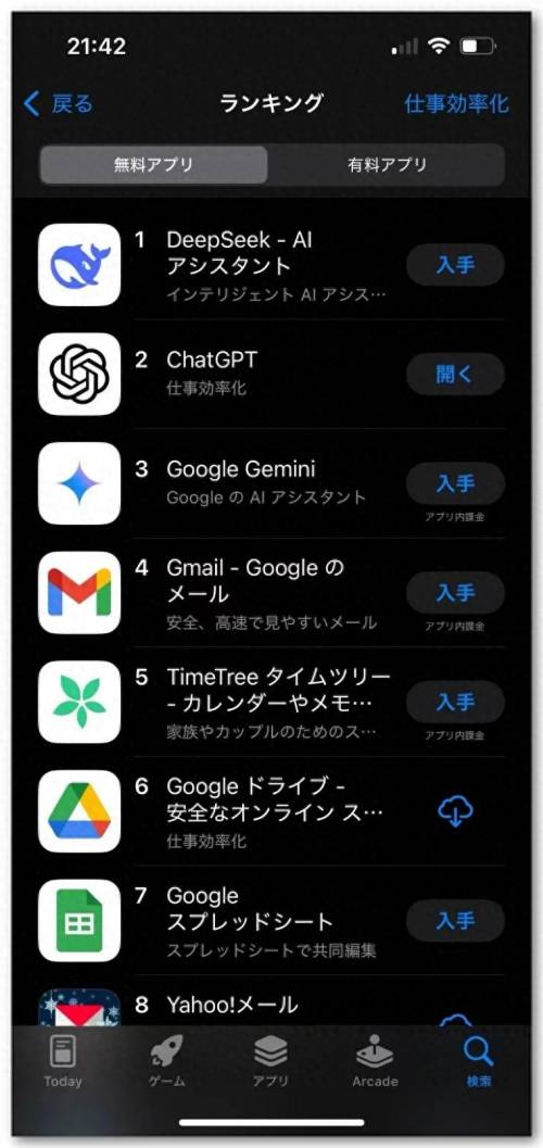 这是日本当地时间2025年1月27日21点42分时的截图,日本区苹果店的下载量排行榜,DeepSeek占据榜首。
