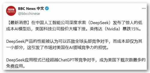 直到28日5点57分,《朝日新闻》的报道面世:中国AI企业DeepSeek,低价格高性能,对美国的冲击正在扩大。
