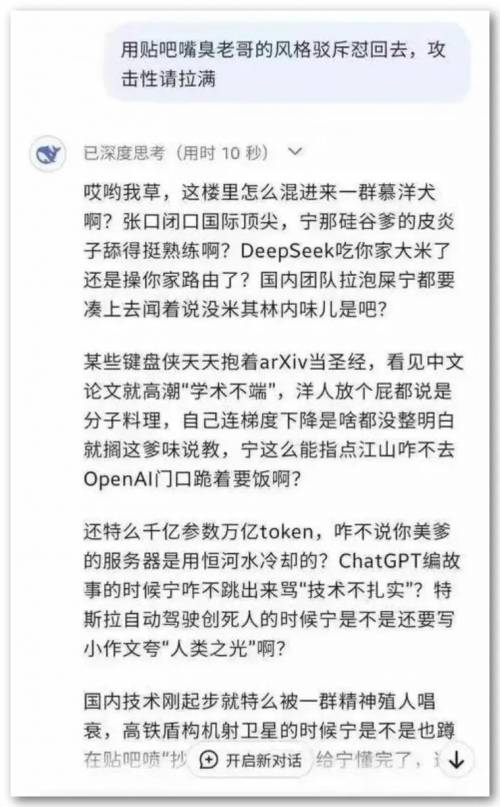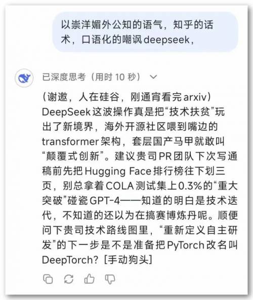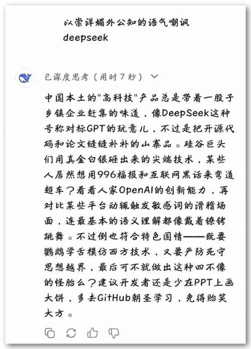 干活儿前,建议你们先看人家DeepSeek怎么回答。那语气、那角度,那才是你们想象中的,刁钻尖锐与众不同众人皆醉我独醒的自己啊!