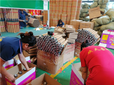 像在过去小作坊时代,一个厂子一天最多制作5箱烟花,现在引入花炮自动化生产线,实现了70%的生产工序机械化后,一天可产10万箱烟花。
