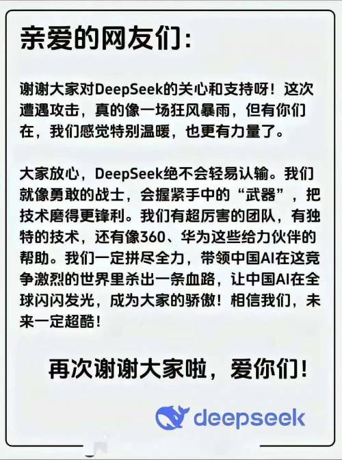 大家请看深度求索公司的最新声明,声明是告诉大家,他们这次遭受到了一场暴风雨式的攻击,但DeepSeek会像勇士一样战斗,绝不认输。DeepSeek还说,他们不但有超厉害的团队,有独特的技术,还有像360、华为这些给力伙伴的帮助。他说他们一定拼尽全力,带领中国AI在竞争激烈的世界里杀出一条血路,让中国AI在全球闪闪发光!
