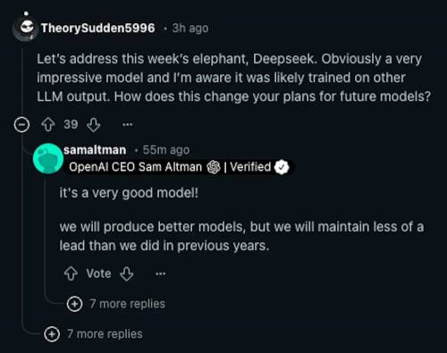 为啥一贯傲慢的奥特曼突然承认自己“一直站在历史的错误一边”?就是一位,他们是真的在模型上落后,他不得不承认,因为全世界都承认了,那是事实!与Open AI不同,DeepSeek的AI模型是开源的,这意味着任何人都可以自由使用,并通过更改底层代码来改变其工作方式。说白了,以后大家都可以发展AI模型。但是,大家都在用的同时,相当于大家一帮助DeepSeek训练AI,这就会让DeepSeek长期受益!与此同时,当天在回答网民有关DeepSeek对OpenAI未来模型发展计划有何影响的问题时,奥特曼毫不掩饰地称赞起DeepSeek的最新模型是“非常好的模型”。奥特曼坦承,尽管他认为OpenAI未来仍将开发出更好的模型,但其领先优势将比往年有所减少。