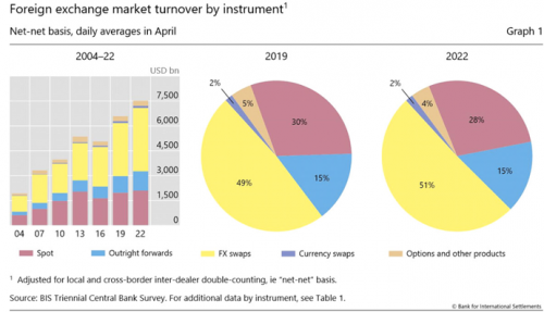 国际外汇交易有五种类型,其中份额最大的是“外汇掉期”(FX swaps),2022年占比51%;第二是“即期交易”(Spot trades),占比28%;第三是“直接远期交易”(Outright forwards),占比15%;第四是占比4%的“外汇期权”(FX Options)等衍生品交易;第五是“货币互换”,占比2%。