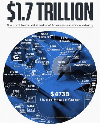 这并不能说明美国的强大,只能说明美国经济的金融化程度惊人。除了少数真有全球竞争力的公司,美国大公司主要靠美国市场的高利润,以及美股市场的高估值,进入全球市值百大的。如美国保险公司市值1.7万亿美元,其中最大的是联合健康集团(该公司CEO被枪杀),在美国名声不佳。