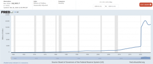 2020年美国M1暴增,也是大规模财政刺激、救助、降息、降准的结果。总体效果是,美国银行账户中的资金流动性相比从前大幅增加,这是近年来美国经济最明显的变化。2022年4月,美国M1达到20.7万亿美元的顶峰,通胀高涨,美联储开始加息紧缩,M1数值下降了一些。