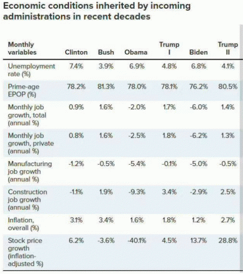 上图统计了克林顿以来,新总统继承前任的上年经济指标。拜登政府留下的指标看上去还不错,2024年GDP实际经济增长率有2.8%,在西方国家中算很好。失业率4.1%是低位,通胀率2.7%降得不错,股票涨了28.8%非常好。