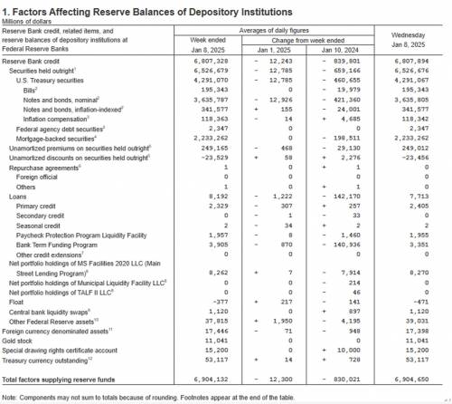 美联储数据是美国经济核心数据,需要重点关注。目前美联储持有资产最主要就是两个,2025年1月8日美联储持有美国国债4.3万亿美元,持有MBS(抵押贷款支持证券,是房屋按揭贷款打包)2.2万亿美元。资产数值不大的有几项,174亿美元的外国货币资产,110亿美元的黄金,152亿美元的特别提款权。