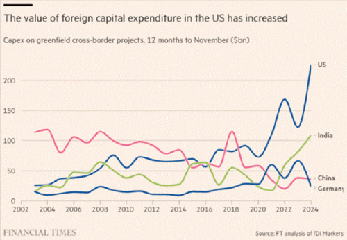 中国、美国、印度、德国绿地跨境投资金额,2002-2024年 FT