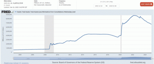 美联储持有的总资产,2008年以前不到1万亿美元。2008年金融危机期间增至2万亿美元,之后奥巴马时期不断“量化宽松”,增至4万亿美元水平。2020年疫情期间短期暴增,2022年中接近9万亿美元。之后加息紧缩回收流动性,2025年1月8日最新数值为6.85万亿美元。