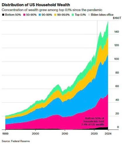 从2008年金融危机开始,美国表面上经济数据大幅增长,依靠的却是货币无限宽松、取消政府发债限制、直接发钱、股票回购注销,日益依赖金融操作。美国贫富分化大幅加剧,普通民众感觉生活压力巨大,巨富阶层的财富却通过金融操作猛涨。除了股市,房地产市场也大幅膨胀,2024年达到了132万亿美元。美国房产税不低,利率也不低,房价却不断创出历史新高,是资金流动性泛滥的迹象。