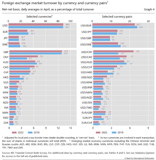 国际清算银行(BIS)每三年会出报告分析全球外汇交易情况,最新一期是2022年的。2022年美元在外汇交易中占比是88.5%,欧元30.5%,日元16.7%,英镑12.9%,人民币7%,这是前五大份额的货币。注意份额总和是200%,因为外汇交易是成对出现的,一种货币份额最高也就是100%,美元的88.5%是极高的份额。