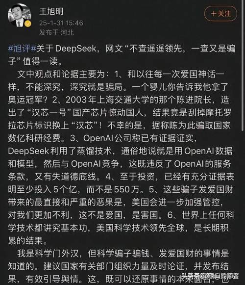 Deepseek的横空出世,扬我国威,国人为之一振。但是,有叫王旭明的竟发文表示:deepseek是剽窃了open ai 技术成果,是龙芯的2.0版。他公然搬运美国媒体“污名化”Deepseek。