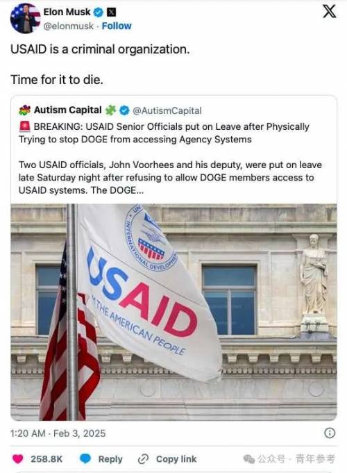 2月3日,马斯克在X上发文称,“USAID是一个犯罪组织,是时候让它消亡了。”