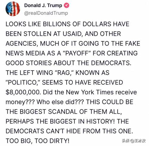 特朗普6号发帖称,美国国际开发署对这些媒体的资助堪称史上最大丑闻!“美国国际开发署和其他政府机构盗取了数十亿美元,其中大部分给了假新闻媒体,作为创造有利于民主党好故事的回报。