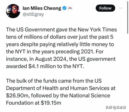 右翼记者Ian Miles Cheong在 X上曝光了美国政府过去五年来向《纽约时报》提供了数千万美元资助的信息,引发巨大争议。
