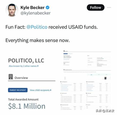 随着美国国际开发署成为全美头条新闻,马斯克转发了一篇热门帖子声称,政治家网站politico和其他几份出版物的公司 politico LLC 从国际开发署获得了大量资金。前福克斯新闻制片人凯莉·贝克尔(Kyle Becker)在X上写道:“有趣的事实:@politico 收到了 USAID 的资金。现在一切都说得通了,”